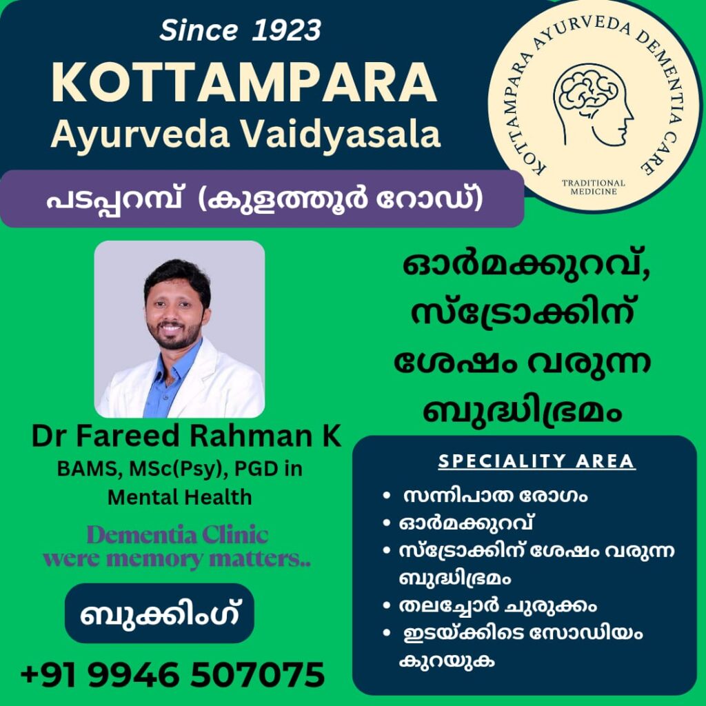 Keywords : Dementia, Vascular dementia, Frontotemporal dementia, parkinson dementia, Alzheimer’s disease, old age memory loss, dementia treatment centre, best dementia doctor, Dr Fareed Rahman, Old age memory loss. neurological disorder, nerocogtive decline, Ayurvedic treatments, ഡിമെൻഷ്യ അഥവാ മറവിരോഗം, അൽഷിമേഴ്സ് രോഗം,വാർദ്ധക്യത്തിൽ വരുന്ന ഓർമക്കുറവ്.