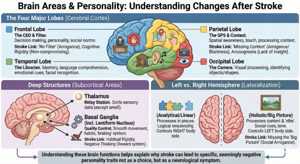 If a stroke damages this braking system, the person loses their “social filter.” They might boast, insult others, or act superior because the part of the brain responsible for modesty and social awareness is literally offline. They aren’t trying to be arrogant; they just lost the ability to stop themselves.